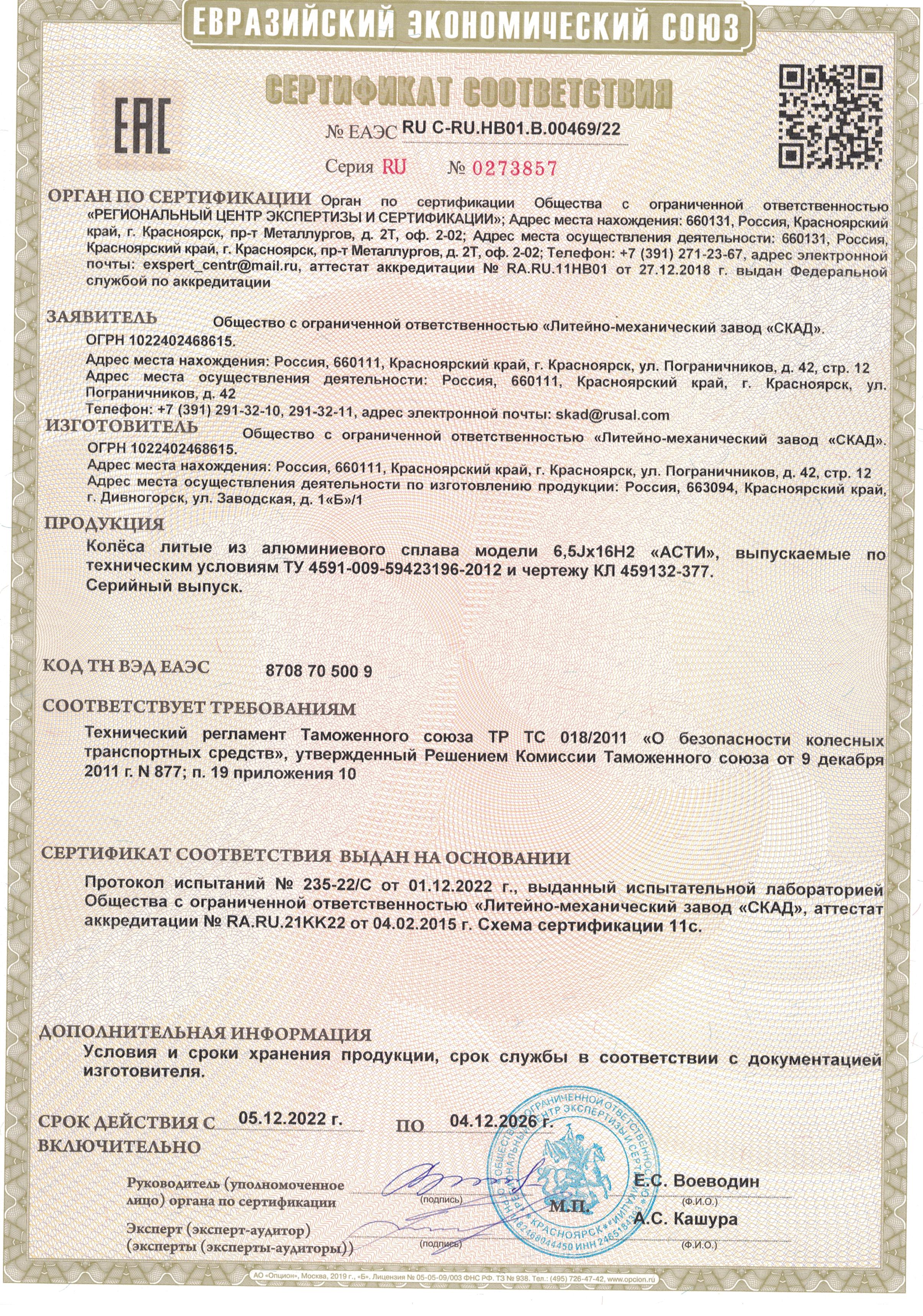 Приобретайте диски SKAD АСТИ 6.500xR16 4x100 DIA67.1 ET40 напрямую от производителя из Сибири. Все представленные в ассортименте диски сертифицированы.