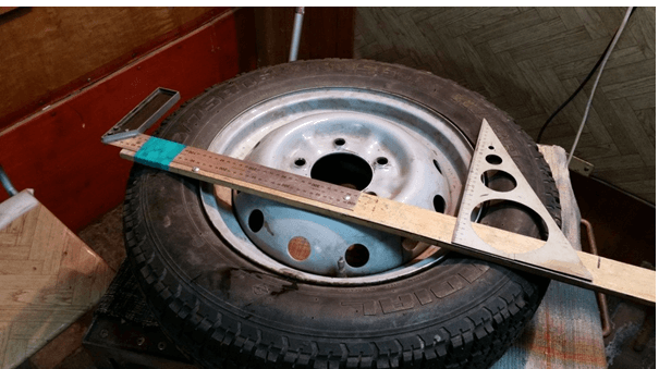 Маркировка со временем затирается, или это обозначение на старой модели, отсутствующей в современных таблицах. В этих случаях, а также при сомнениях в адекватности обозначений требуется самостоятельный замер. Диск снимают с оси, используя домкрат, башмак и баллонный ключ. Снятый диск кладут «лицом» вниз на поверхность. Кроме рулетки, понадобятся линейка или уровень. Начинают с замера ширины точно между краями диска (обозначается как B). Когда его положат, то уровень и линейку помещают на ободе. Рулетку ставят под углом 90° к привалочной поверхности, и доходить она должна до нижнего уровня рейки. Так получают показатель A. Затем от A отнимают половину B. Результат вычислений будет надежным, если не ошибиться ни на миллиметр.